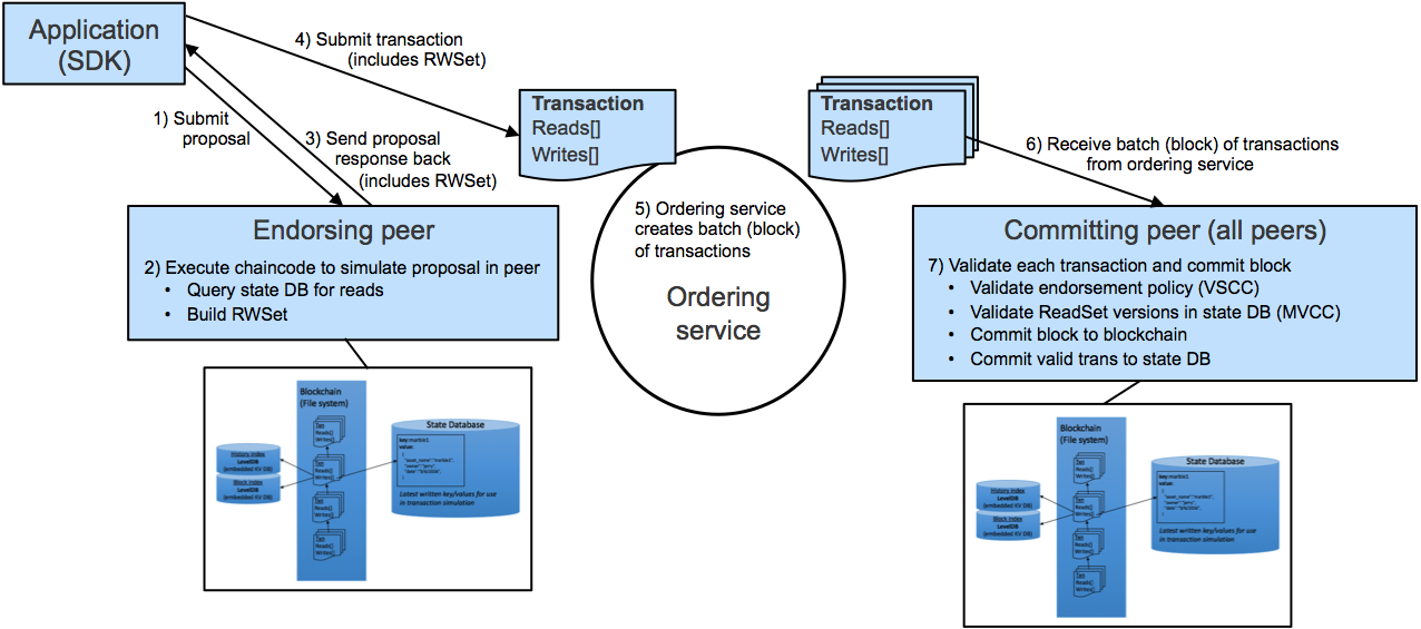 从图的左侧开始:1) 应用程序将交易提案提交给背书对等节点。2)